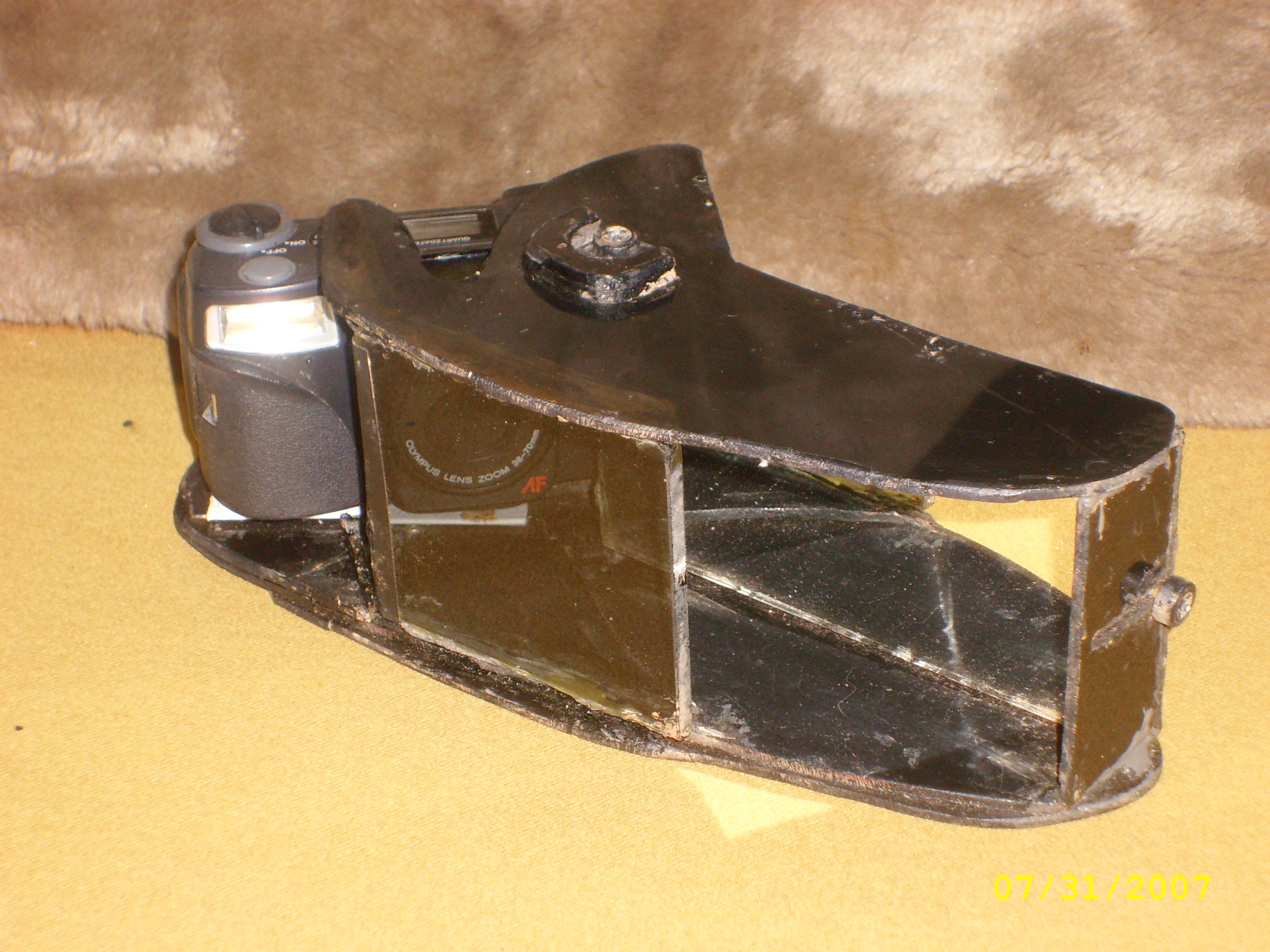 (Sizing and placing the mirrors is a little tricky and required, for me, trial and error. The tinted glass should be just large enough horizontally that its far (left, in my case) edge should be just beyond the range of the camera (the right edge should present no problem). Put the the camera on a table top and the tinted glass glass (about 3.5" in my case)about an inch in front of it. If you have a digital camera, turn it on and look at the image, assuring yourself that the right side of the glass cannot be seen. The glass should be more or less at a 45 degree angle, and the left side just barely shouldn't be seen either. Then put the other mirror to the left of the camera, and check to see that you can get a reflected image in it by pivoting it and turning it to make the two images coincide. It's not as complicated as it sounds.)