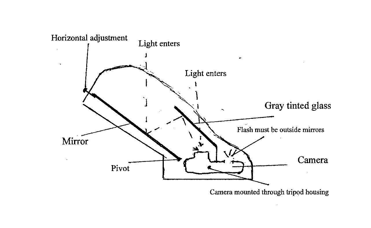 The idea is that the camera is mounted on the base with a piece of gray (neutral) tinted glass fixed at an angle in front of it. This allows light to go through to the lens, but will also reflect a very faint image from any light that hits the back side of it.